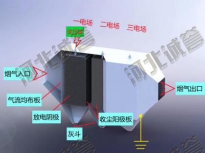 高壓電暈放電使得粉塵產生荷電,荷電后的粉塵在電場力的作用下到達集塵板/管。通過噴嘴和布水管噴水將沉積在收塵板上的粉塵沖洗下來,帶有粉塵的液體沿著收塵板流入下方集斗液。避免二次揚塵,可達到很高的除塵效率。
