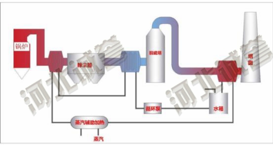 脫硫塔入口煙道設(shè)置煙氣冷卻系統(tǒng)吸收高溫?zé)煔庵械臒崃繉?duì)熱媒加熱,加熱后熱媒進(jìn)入脫硫塔出口煙氣加熱系統(tǒng)對(duì)煙氣加溫,經(jīng)加溫后的煙氣再排放,可顯著降低白煙視感。當(dāng)脫硫塔前端煙氣熱量不足以加熱后部煙氣時(shí),可通過(guò)蒸汽進(jìn)行輔助加熱。